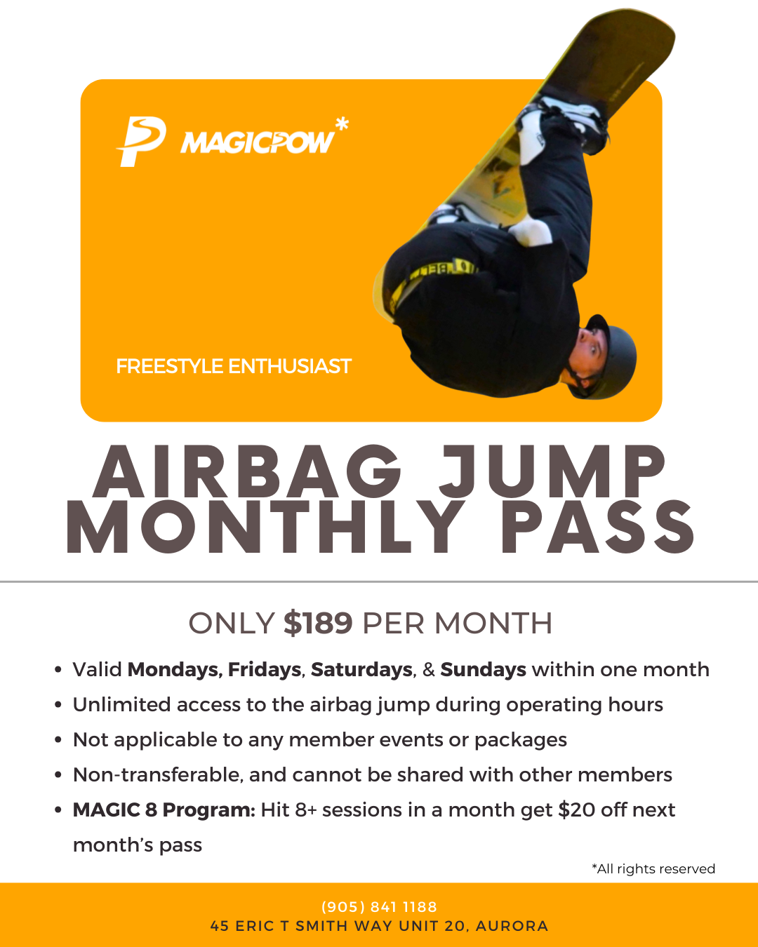 As a MagicPow member, you now have the exclusive opportunity to enjoy unlimited Airbag Jump access every Monday, Friday, Saturday, and Sunday of a single month!